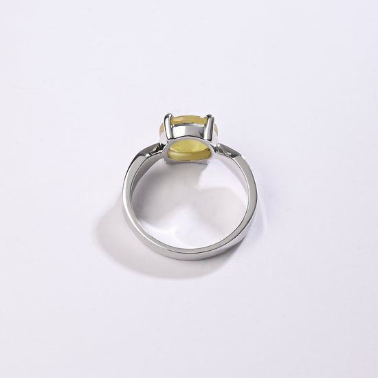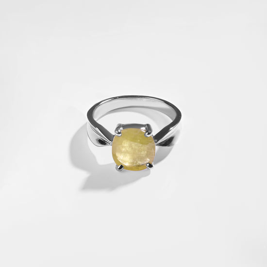 Radiating purity and brilliance, our yellow sapphire ring is set in 925 sterling silver. Known for its golden shimmer, this exquisite gemstone reflects light beautifully, creating a warm and radiant glow. Believed to attract prosperity and success, yellow sapphire is thoughtfully designed to touch your skin, enhancing its astrological energy. Celebrate the perfect blend of elegance and authenticity with a 100% genuine yellow sapphire.
