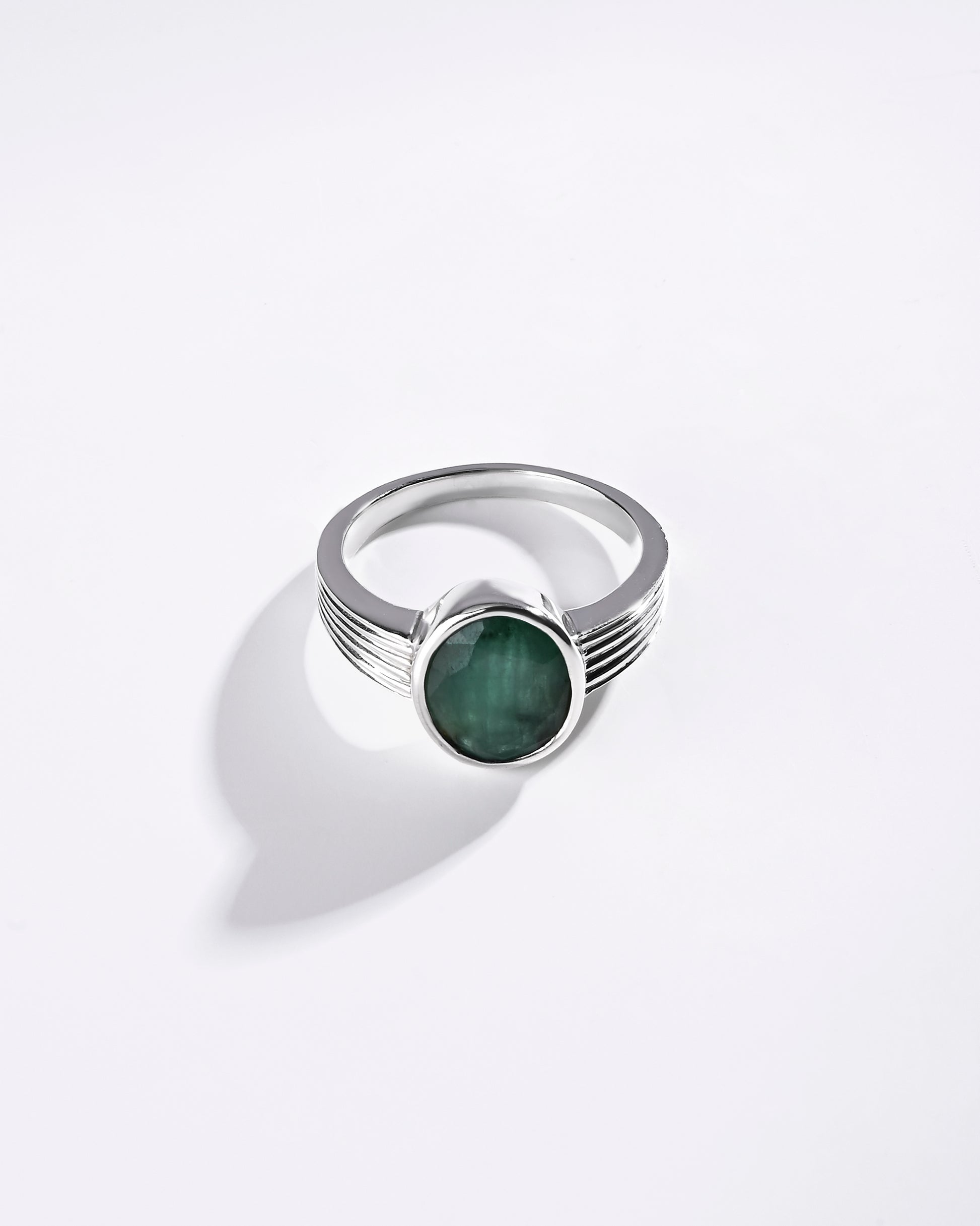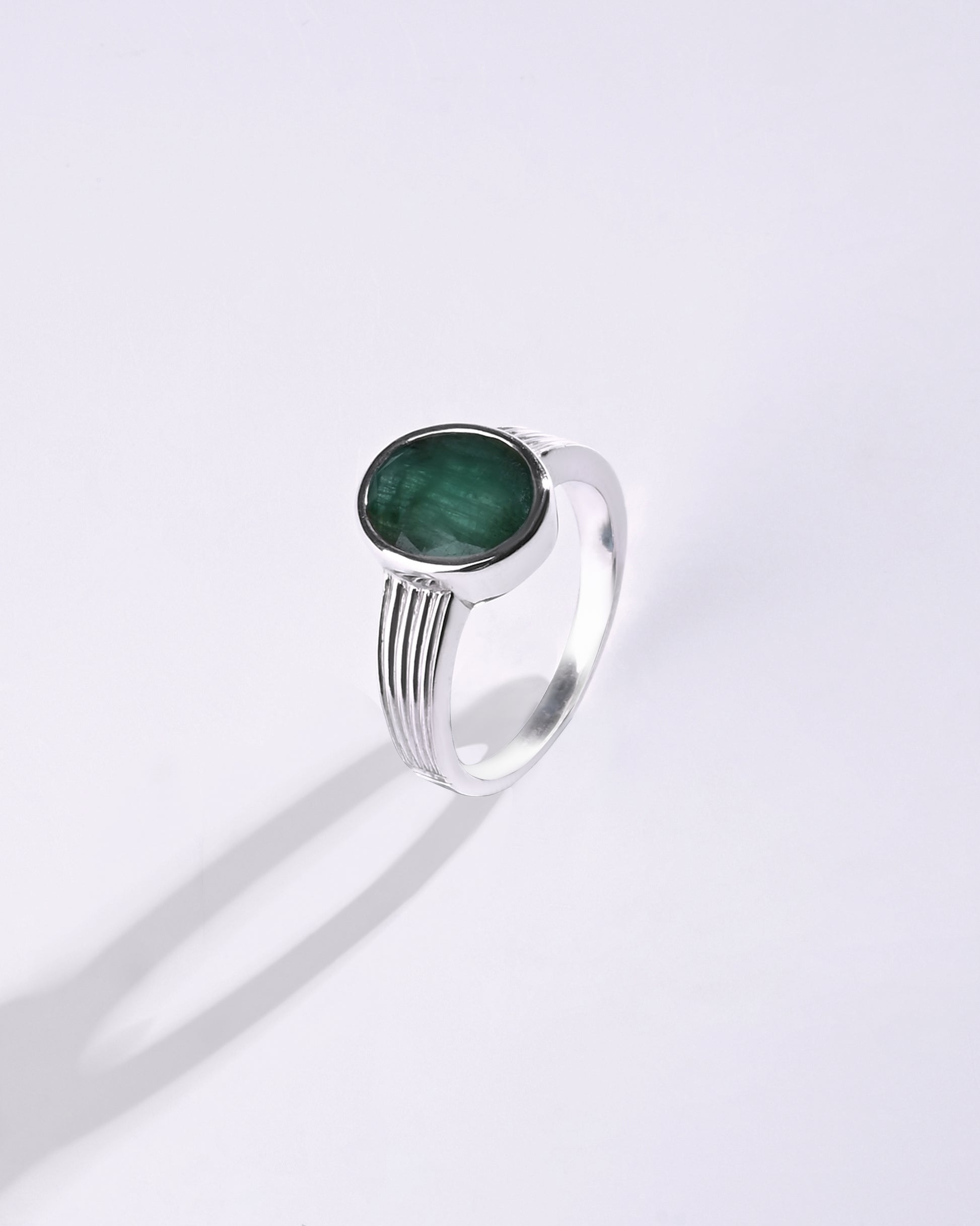 The purity of nature shines in our rich green emerald, set in 925 sterling silver. This precious gemstone from the Beryl family owes its vibrant green hue to natural traces of chromium. Cherished for centuries as a symbol of renewal and vitality, emerald (Panna) is carefully designed to touch your skin for optimal astrological benefits. Experience 100% authentic emeralds in a luxurious and expertly crafted ring.