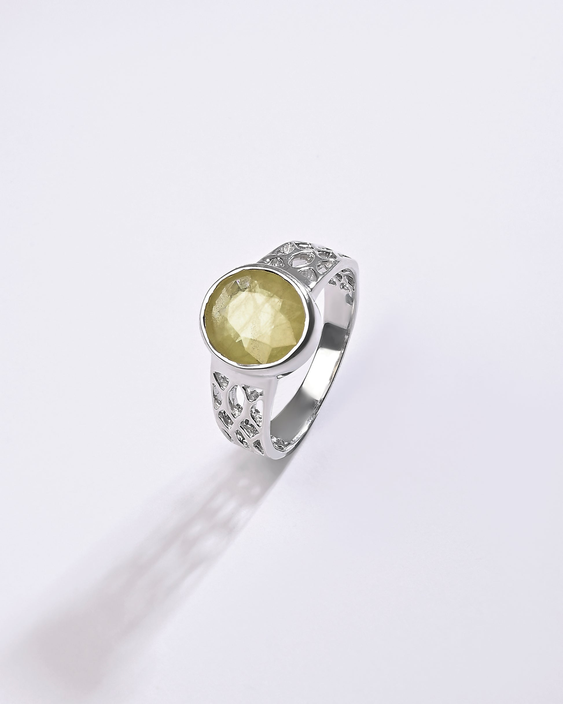 Radiating purity and brilliance, our yellow sapphire ring is set in 925 sterling silver. Known for its golden shimmer, this exquisite gemstone reflects light beautifully, creating a warm and radiant glow. Believed to attract prosperity and success, yellow sapphire is thoughtfully designed to touch your skin, enhancing its astrological energy. Celebrate the perfect blend of elegance and authenticity with a 100% genuine yellow sapphire.