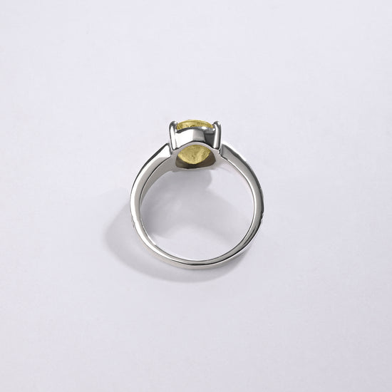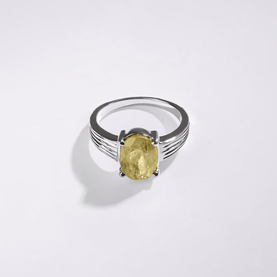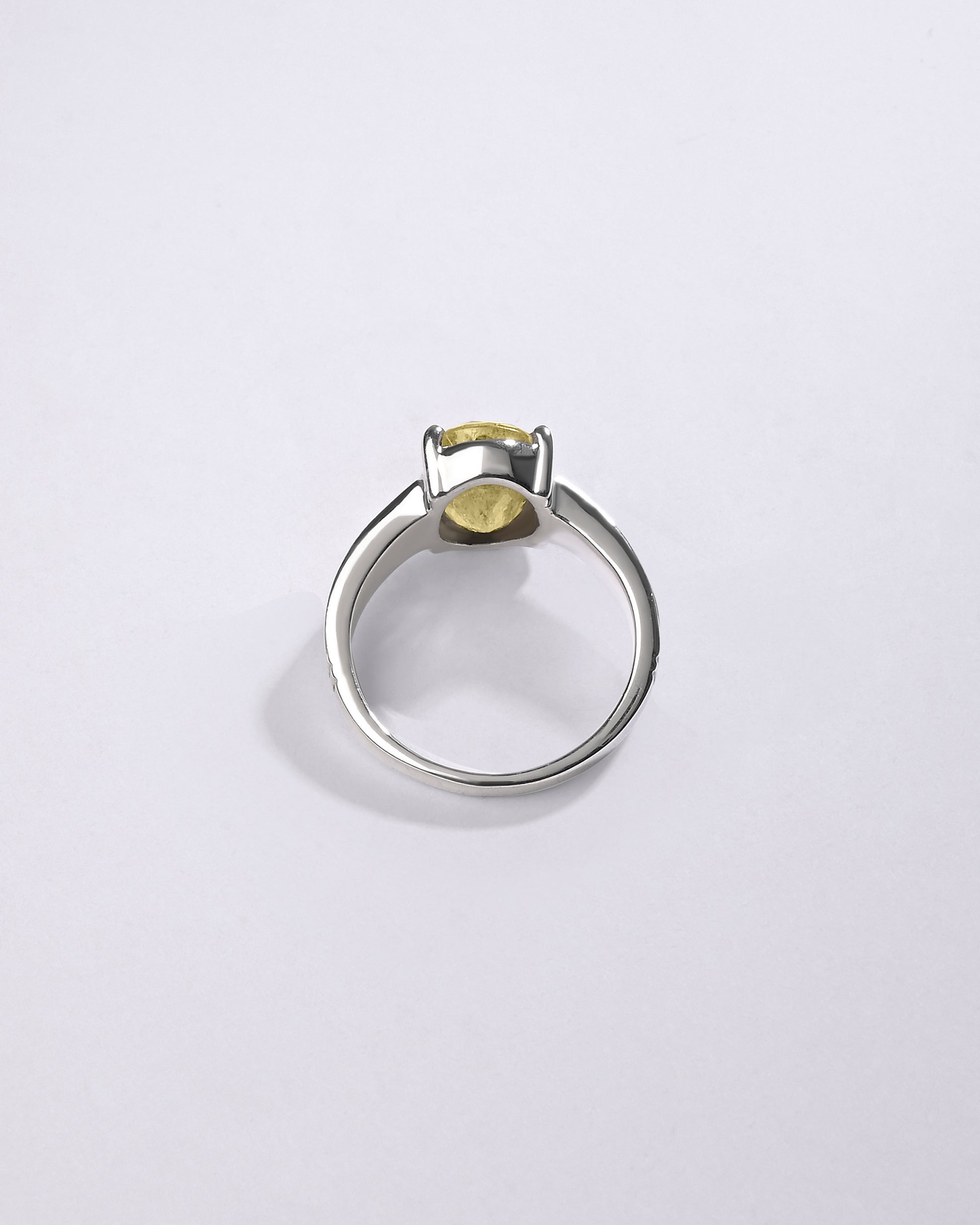 Radiating purity and brilliance, our yellow sapphire ring is set in 925 sterling silver. Known for its golden shimmer, this exquisite gemstone reflects light beautifully, creating a warm and radiant glow. Believed to attract prosperity and success, yellow sapphire is thoughtfully designed to touch your skin, enhancing its astrological energy. Celebrate the perfect blend of elegance and authenticity with a 100% genuine yellow sapphire.