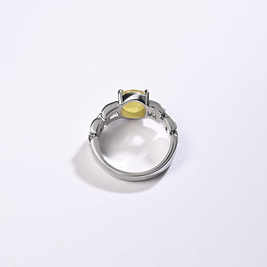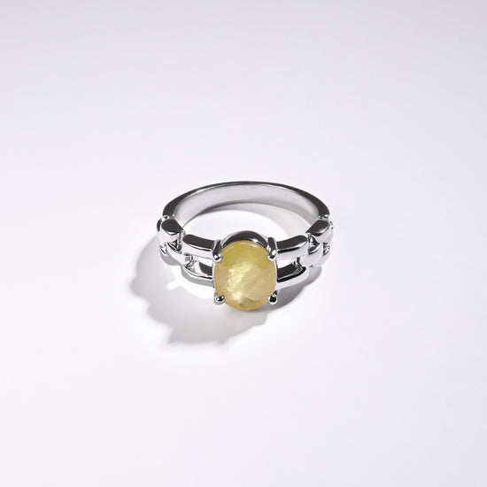 Radiating purity and brilliance, our yellow sapphire ring is set in 925 sterling silver. Known for its golden shimmer, this exquisite gemstone reflects light beautifully, creating a warm and radiant glow. Believed to attract prosperity and success, yellow sapphire is thoughtfully designed to touch your skin, enhancing its astrological energy. Celebrate the perfect blend of elegance and authenticity with a 100% genuine yellow sapphire.