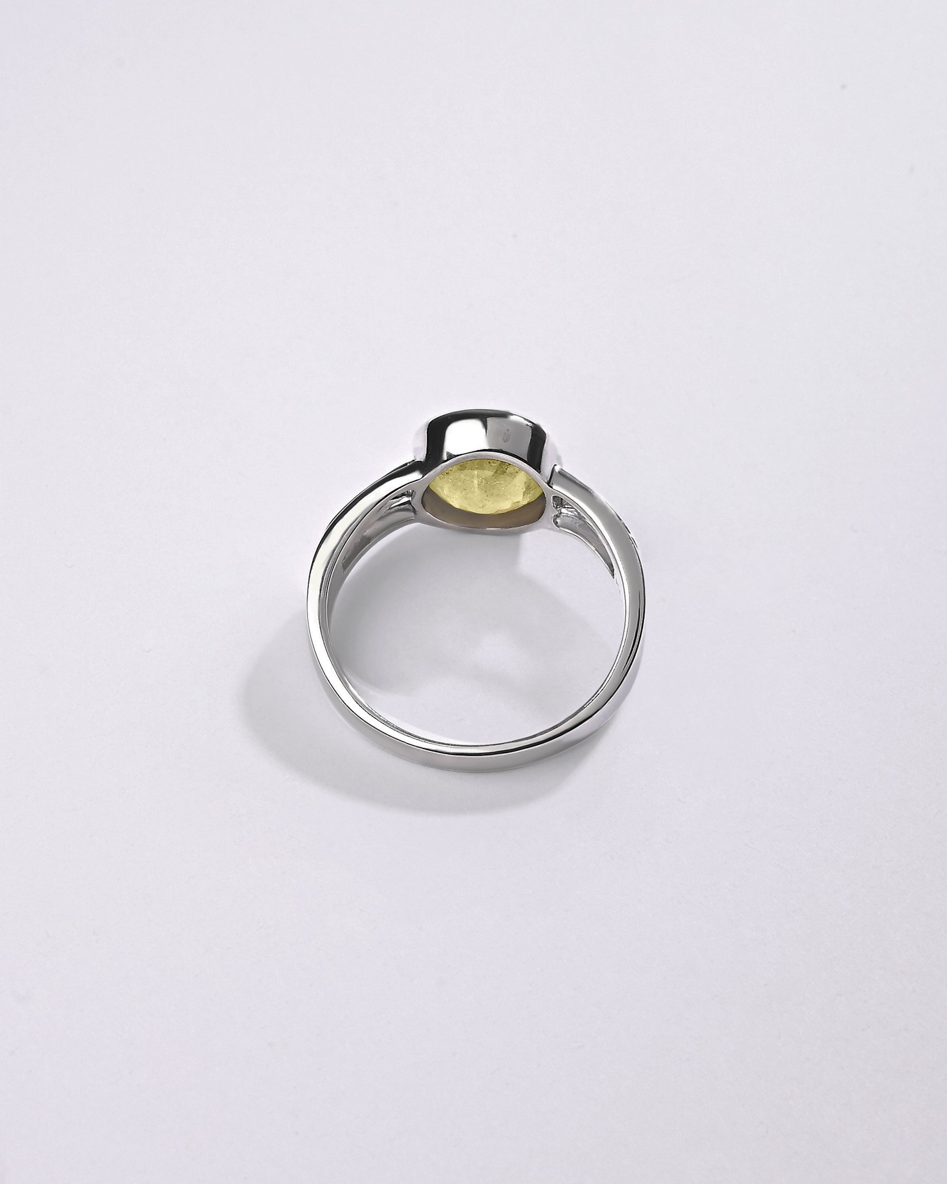 Radiating purity and brilliance, our yellow sapphire ring is set in 925 sterling silver. Known for its golden shimmer, this exquisite gemstone reflects light beautifully, creating a warm and radiant glow. Believed to attract prosperity and success, yellow sapphire is thoughtfully designed to touch your skin, enhancing its astrological energy. Celebrate the perfect blend of elegance and authenticity with a 100% genuine yellow sapphire.