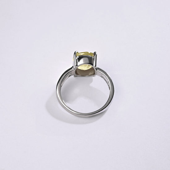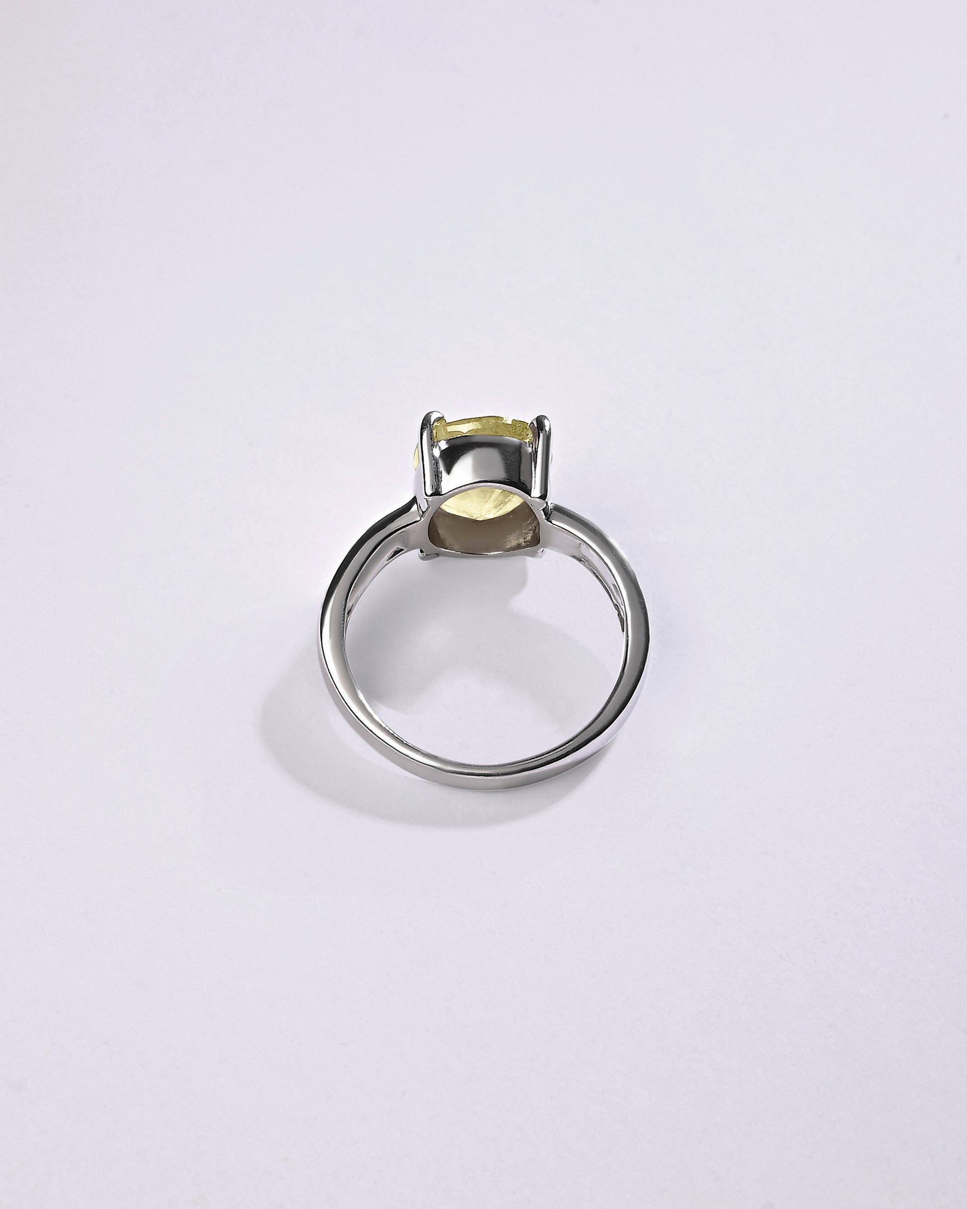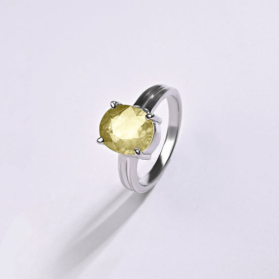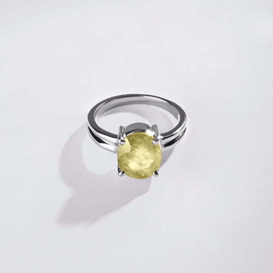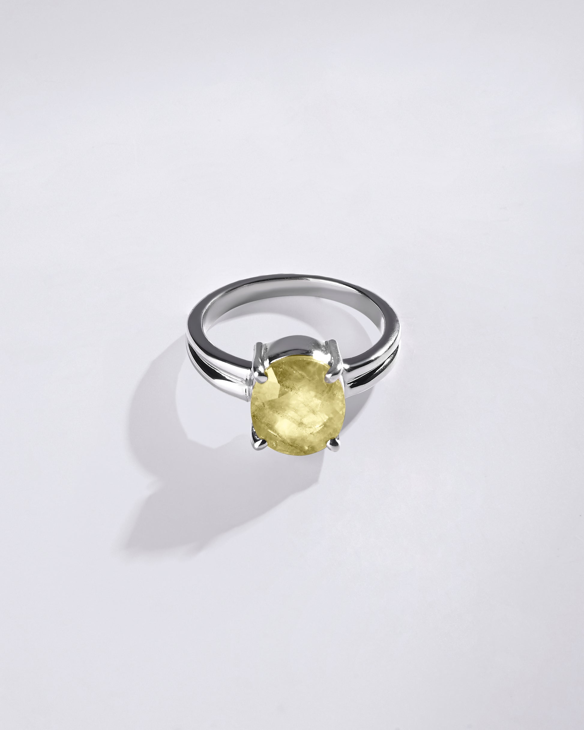 Radiating purity and brilliance, our yellow sapphire ring is set in 925 sterling silver. Known for its golden shimmer, this exquisite gemstone reflects light beautifully, creating a warm and radiant glow. Believed to attract prosperity and success, yellow sapphire is thoughtfully designed to touch your skin, enhancing its astrological energy. Celebrate the perfect blend of elegance and authenticity with a 100% genuine yellow sapphire.