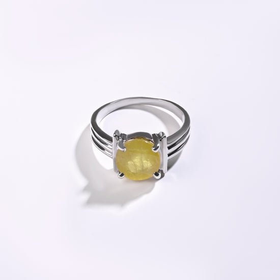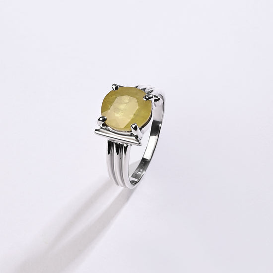 Radiating purity and brilliance, our yellow sapphire ring is set in 925 sterling silver. Known for its golden shimmer, this exquisite gemstone reflects light beautifully, creating a warm and radiant glow. Believed to attract prosperity and success, yellow sapphire is thoughtfully designed to touch your skin, enhancing its astrological energy. Celebrate the perfect blend of elegance and authenticity with a 100% genuine yellow sapphire.