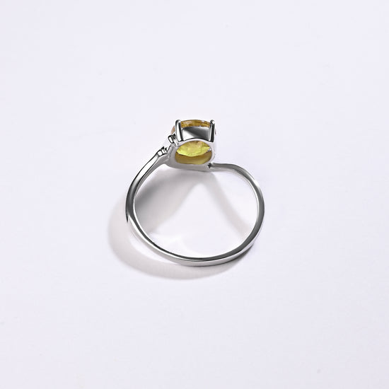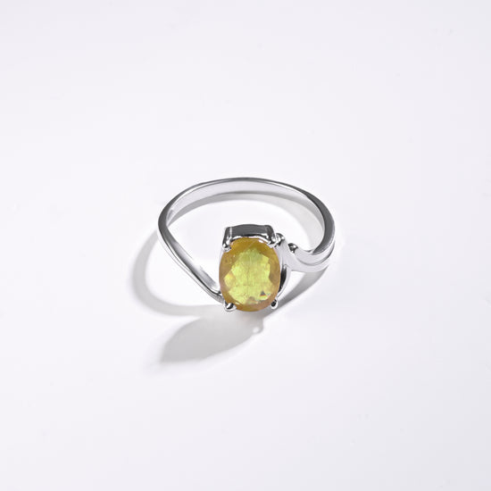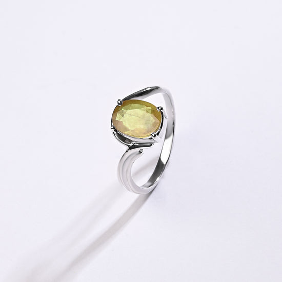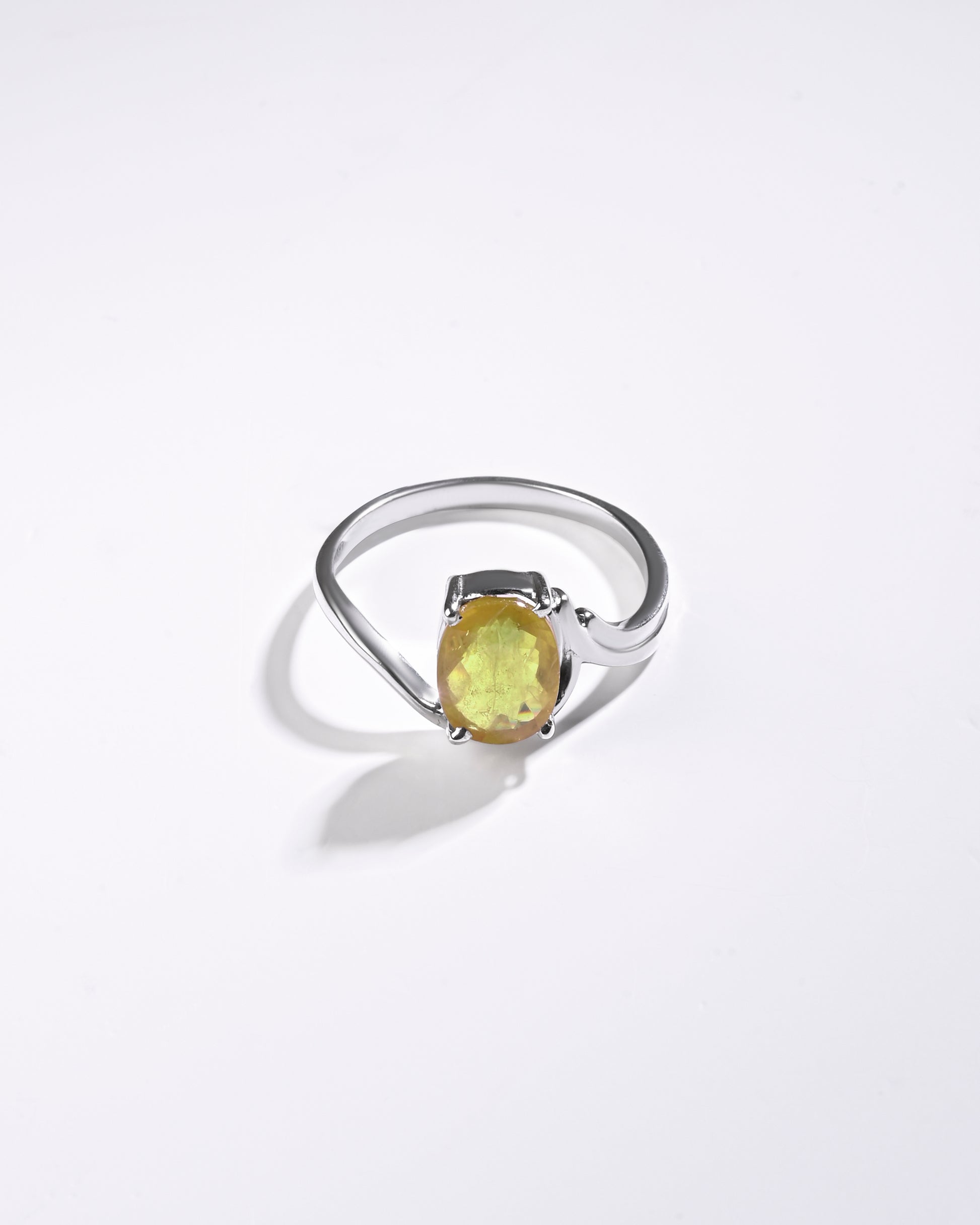 Radiating purity and brilliance, our yellow sapphire ring is set in 925 sterling silver. Known for its golden shimmer, this exquisite gemstone reflects light beautifully, creating a warm and radiant glow. Believed to attract prosperity and success, yellow sapphire is thoughtfully designed to touch your skin, enhancing its astrological energy. Celebrate the perfect blend of elegance and authenticity with a 100% genuine yellow sapphire.