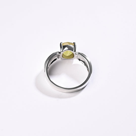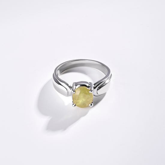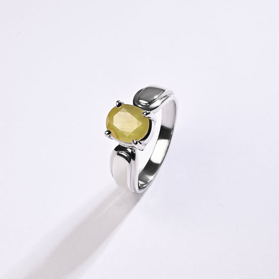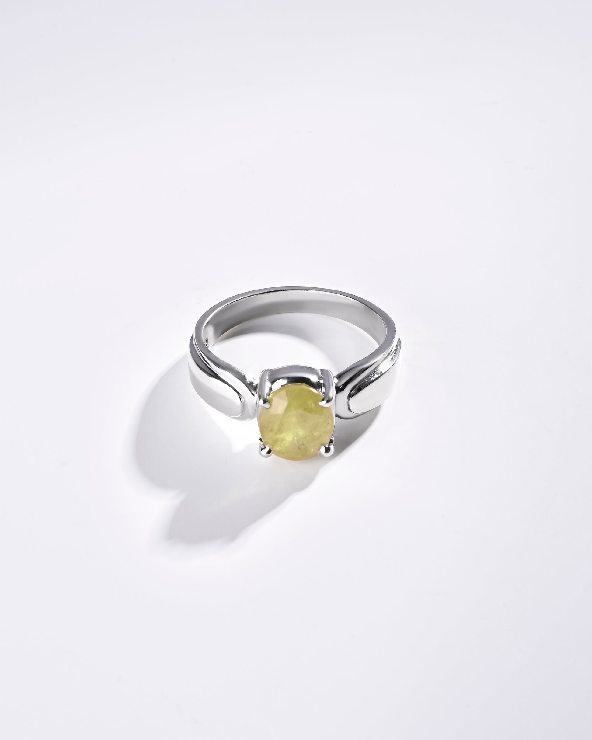 Radiating purity and brilliance, our yellow sapphire ring is set in 925 sterling silver. Known for its golden shimmer, this exquisite gemstone reflects light beautifully, creating a warm and radiant glow. Believed to attract prosperity and success, yellow sapphire is thoughtfully designed to touch your skin, enhancing its astrological energy. Celebrate the perfect blend of elegance and authenticity with a 100% genuine yellow sapphire.
